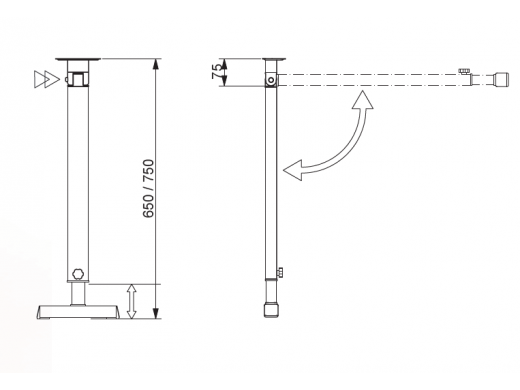 An der Beinbasis befindet sich ein verbreiterter T-förmiger Fuß, der für noch mehr Stabilität sorgt. Das Bein verfügt zusätzlich über eine teleskopische Höhenverstellung im Bereich von 650-750 mm.