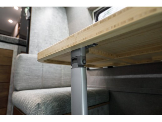Ein äußerst solides Bein für den Einsatz in Wohnmobilen und Wohnwagen, hergestellt aus stranggepresstem, eloxiertem Aluminium. Es verfügt über ein Scharnier unter der Montagebasis der Tischplatte, sodass das Bein direkt unter die Tischplatte geklappt werden kann. Das Scharnier besteht aus Druckguss Aluminium und die Tischbasis besteht aus verzinkten Stahlplatten, was die Struktur äußerst langlebig macht.