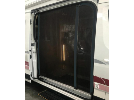 Plissee-Moskitonetz für Schiebetüren, angepasst an die Ford Transit. Das Moskitonetz verhindert das Eindringen von Insekten und Schmutz in den Innenraum. Das Moskitonetz besteht aus Aluminium und verfügt über eine niedrige Führung, auf der Sie laufen können. Durch das Schiebesystem können Sie das Moskitonetz in jeder Position öffnen.