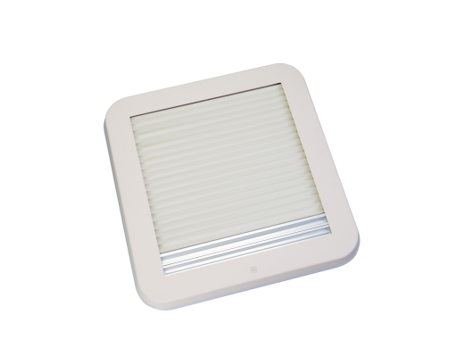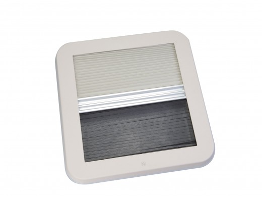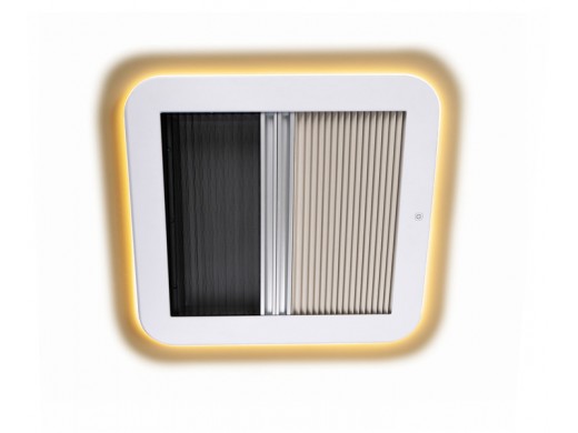 Roof window dedicated for installation in campers and caravans. It has double, tinted acrylic glazing with a UV protective coating. The window is equipped with an integrated pleated blind, mosquito net and lighting. It is quiet and tight thanks to the use of high-quality silicone gaskets.