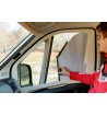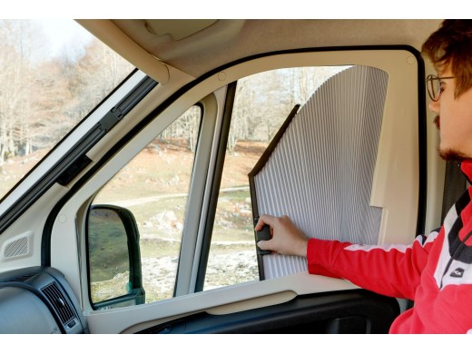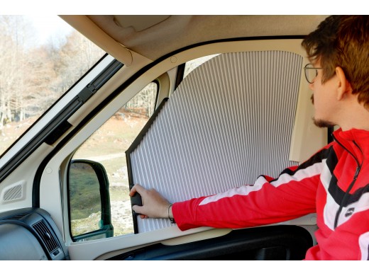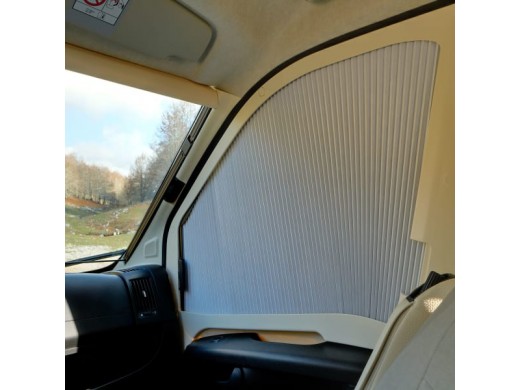 Pleated blackout blinds for side windows dedicated to the Fiat Ducato X250, X290 model. They effectively darken and cover the interior of the car when parked. They have an external aluminum coating that limits the heating of the interior.