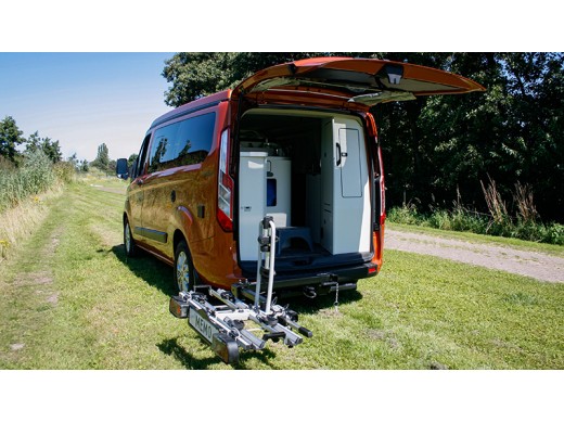 A well-known problem with converting vans into campervans is finding a suitable bike rack. The towbar-mounted bike rack locks the rear doors when you need to open them. Rear door racks have a number of limitations - they are not suitable for e-bikes, they require mounting the bikes at a high height, they can only carry two standard bikes, and they still cause damage to doors and hinges with long-term use.